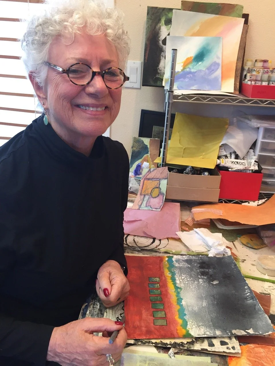 My first art teacher was my mother, who was a serious painter. When I first became driven to pictorial art after I retired from psychotherapy I enrolled in every art class offered at SRJC. Other local private teachers were Jean Warren, Susan Cornelis and Lisa Beernsten. Other influences were years-long studies of ceramics and calligraphy which I loved for its orderliness, beauty of form and exactness of placement.